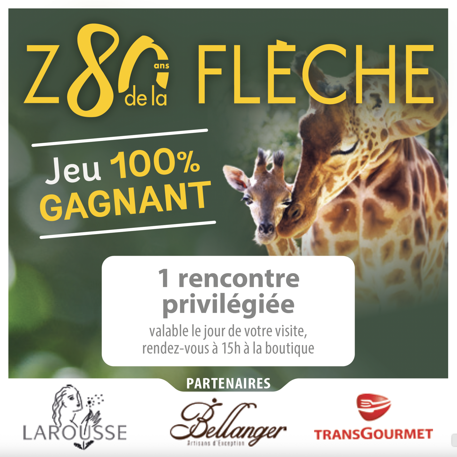 Les 11 & 12 avril, ainsi que les 6 & 7 juin, chaque visiteur se verra remettre un livret ludique qui accompagnera sa visite : questions sur l'histoire du parc, jeux pour les enfants.. En fin de parcours, déposez votre livret dans l'urne prévue à cet effet et tentez de remporter un séjour en Safari Lodge face aux girafes