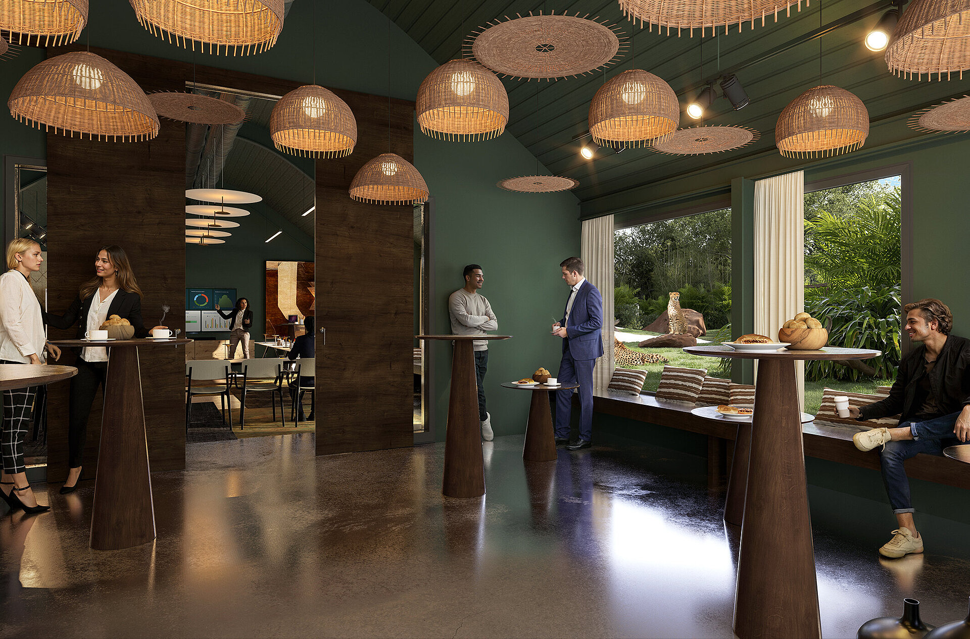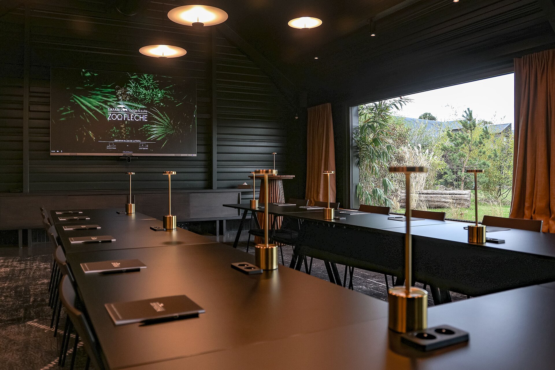 Salle équipée high-tech, éclairée naturellement, avec vue sur les guépards. L’alliance parfaite entre efficacité professionnelle et évasion au coeur du Zoo de La Flèche.
